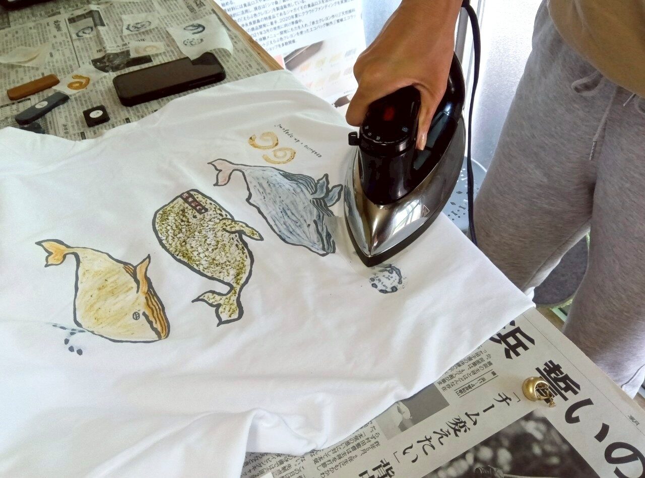 クジラのイラストが描かれたオリジナルTシャツに〈えらぶ色クレヨン〉で色付けをします。